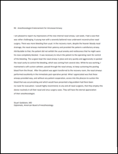 If required, your distributor will complete this form for surgical facilities that want to use the airway. Also provided here are links to supporting documents such as our FDA Clearance Letter, US Patent document, and an Anesthesiologist Endorsement Letter.